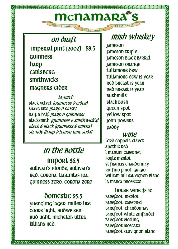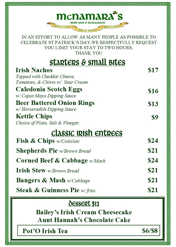 SAINT PATRICK'S DAY MENU